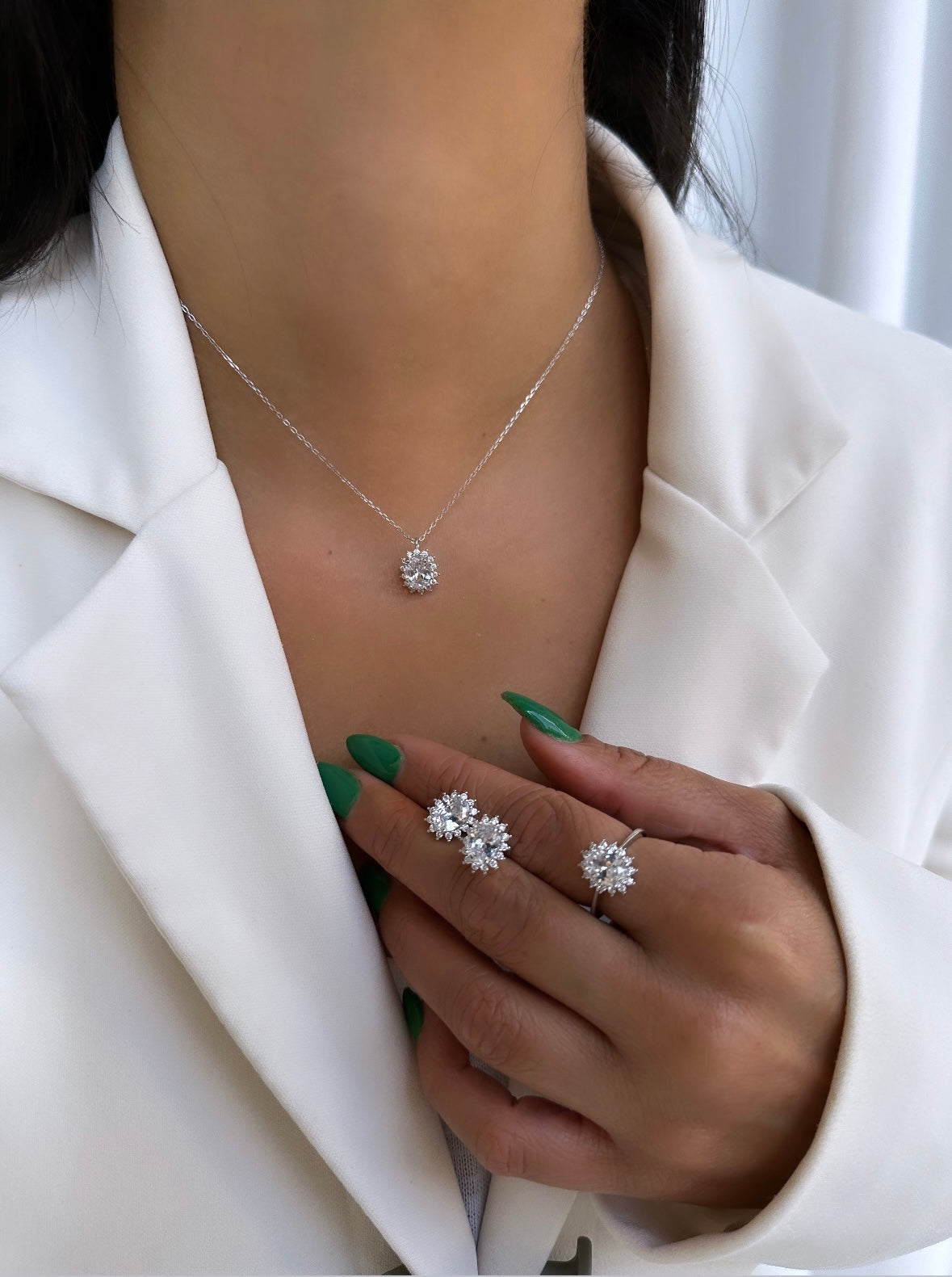 עדינות עם קצה של יוקרה - עגילים צמודים בעיצוב יוקרתי, עשויים מכסף טהור 925, משובצים בזירקון מרכזי עגול גדול ומסביבו זירקונים קטנים נוצצים.